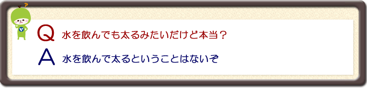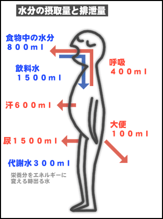 | “水を飲んでも太る”という言葉があるが、水はいくら飲んでも体内で脂肪にかわるようなエネルギーは持っていないから大丈夫じゃ。毎日せっせと水分を補給することだよ。 一時的に体内に水をためることはあっても、尿や汗として水分が出てしまえば、体重は すぐに戻るんだよ。 人間のからだを構成する成分のなかで50%~60%が水分。 人間の体の水分摂取量と排泄量は1日約2リットルで、ほぼバランスがとれている。図のようにこんなに水分が体をまわっているんだなあ。 水は代謝を促進し、脂肪を分解するときにも水が使われるから、むしろ積極的にとったほうがいいのだよ。ダイエット中は食物からの水分量が減る傾向があるうえ、水分まで控えるのでは、かえってやせにくくなるぞ。砂糖やアルコールを含まない、お水やお茶を1日1リットル以上飲んでほしい。食事のたびに4、5回に分けて飲めばクリアできるのでは。体を冷やさないためにもあまり冷たすぎないのがいいね。 サウナにはいって汗をかいても、水分補給をしないのではかえってだるくなってしまうんじゃ。だから水は大切。ダイエット中も積極的にとってほしい。 |