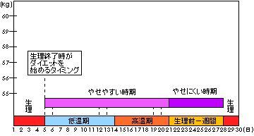 | ダイエットをしよう。というその気持ちが大切だから、決意したらすぐはじめること だ。しかし実は、より効果的な方法として、女性だけにはダイエットチャンスがあるのじゃ。 それは、女性には、やせやすい時期があって、そのタイミングを利用 することで、体に無理のないかたちできれいにやせることができるのだ。それは生理が終わってすぐが一番。 下の図のように、生理前の一週間の“やせにくい時期”、生理が終わった後の“やせやすい時期”が あって、ダイエットの効率はよくするには、女性の生理周期と大きく関 わっているのだよ。 生理前は体がむくんで体重も増え気味でイライラしやすく、この時期は、体を守ろうと体重が 増えるのだ。生理終了日は増えていた体重もストンと元に戻るから、この時からはじ めるのがダイエットチャンス。 今ダイエットをしていて、なかならヤセないと思っている人は、生理が近 いかもしれないな。ダイエットをしても効果が出にくい 生理前一週間や生理中は、精神的にも肉体的にも不安定。この時期はゆ っくりからだをやすめるのが得策じゃな。 |