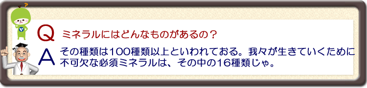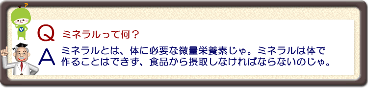 | 人間の体は細胞からできている。細胞はタンパク質や脂質などの分子で成り立っているが、この分子の構成成分が元素じゃ。よく耳にする炭素や水素、酸素、窒素などは元素であり、ミネラルも元素に分類される。 一般的にミネラルとは、人間の体内に存在する元素のうち、炭素や水素、酸素、窒素を除いたもののことをいい、その中でも、生体にどうしても欠かすことができないミネラルを必須ミネラルと呼んでいる。 必須ミネラルの摂取量が不足すると、たちまち欠乏症が起き、さまざまな病気を引き起こす。ミネラルはわずかな量だが体に重要な役割を果たしているのじゃ。 |