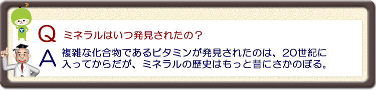| 紀元前から人々に知られた貧血は、18世紀に鉄の欠乏が原因であることがわかった。また、紀元前からあった甲状腺腫も、19世紀にヨウ素の欠乏が原因だと発見された。しかし、多くの微量ミネラルの必要性がわかってきたのは、20世紀に入ってからじゃ。 例えば、中近東地域で、貧血、発育不全、性腺機能低下を起こした患者の治療を行ったところ、貧血は銅、それ以外の症状は亜鉛で治療するということがわかった。 こうしていろんな病気との関係を調べていくにつれ、様々なミネラルの必要性が明らかになってきたのじゃ。 |