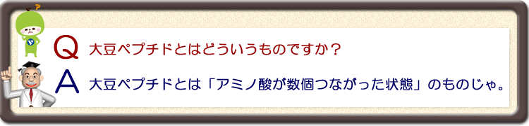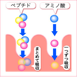 アミノ酸が長く繋がっておる大豆タンパク質が消化管の中で完全に消化されてアミノ酸になる途中のものじゃな。 従来タンパク質はアミノ酸にまで分解されてからはじめて吸収されるものと思われておった。ごく最近になってこれだけでなく、アミノ酸2,3個がつながったペプチドの形でも吸収されることが発見されたんじゃ。普通のアミノ酸が1個に対してペプチドは2,3個つながった形で吸収されるのじゃから、効率的に摂取でき(※下イメージ参照)、特にスポーツ選手の疲労回復に効果ありとして注目を集めておる。 |