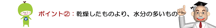 | 献立にスープなどの汁ものを加えると、少しの食事でも満足感が得られると思うが、これは、水分で胃が膨れるからじゃ。だから、乾燥したものより水分の多いものを選べば、おなかが いっぱいになってより満足感が得られるぞ。 |