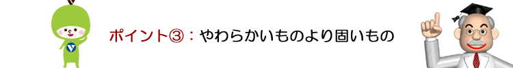 | かむことが満腹感を得る手助けをするのは前に説明した通り。 よくかんで食べられるものといったら、やわらかいものより、やっぱり固いもの。固ければ食べるのに時間がかかるので、食べ過ぎ 防止にもなるぞ。 |