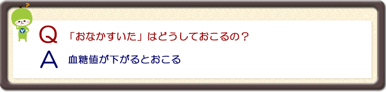 「おなかすいた!」これは、血糖値と関係しているのじゃ。 食事をすると、食べ物の栄養素が胃や腸で消化され、 血液中にブドウ糖が増加する、この値のことを血糖値というのだよ。 血糖値が増加すると、脳の視床下部にある満腹中枢が刺激されて、 「おなかいっぱい」を感じるのじゃ。空腹を感じるのはその逆で血糖値が下がった時じゃな。 血糖値を下げるのはインスリンというホルモンで、簡単に説明するとこういうことじゃ。 |