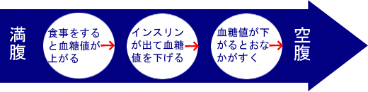 | 食事を摂ることによって上がったり下がったりする血糖値。 これが脳の視床下部の摂食中枢を刺激するため、満腹感、空腹感を感じるというわけだな。 |