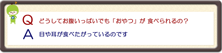 | 「おなか空いた」はふつう、血糖値が下がったり胃に食べ物がからになったりと体のサインによって感じる。 しかし、満腹でもおいしそうなもの、いい匂いがするという目や鼻からの情報で食べていると、空腹に関係なく食べてしまうのじゃ。 全くおやつはニクい奴じゃ。 |