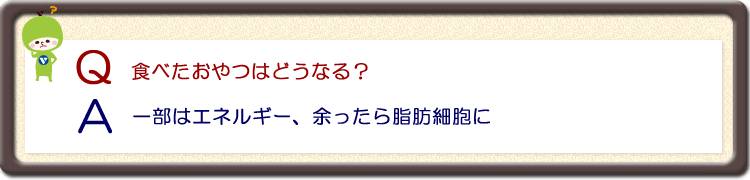 | 食べたおやつが体の中でどうなるのか、仕組みを説明しよう。 おやつの甘みの元である糖分は、体内に入ると腸で吸収され、肝臓に送られ、一部は肝臓に貯蔵される。また一部はブドウ糖 (血糖)となり、血液によって体内に送られ、筋肉や臓器でエネルギーとして消費されるが、消費しきれなかった分は、脂肪細胞に貯えられ、皮下脂肪などとなるため太ってしまうのじゃ。 さらに、砂糖を食べるとまたすぐに食べたくなるという難点もある。 砂糖を食べると血糖値が急激に上がる。その反動でインスリンというホルモンが血糖値を下げようとたくさん分泌されると、急激に下がり、空腹中枢を刺激されるため、空腹を感じやすくなるのだ。 おやつを食事代わりにして筋肉を作る元になるタンパク質をきちんと摂取しないと、筋肉量が減り、筋肉での消費エネルギー量が減るから脂肪が燃えにくくなり、さらに太りやすくなってしまうのじゃ。 |