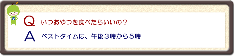 | 食事によって上がった血糖値は食後3時間ぐらいで元に戻る。血糖値が下がるとおなかが空くのじゃが、その他にもイライラしたり、脳のはたらきが鈍って集中力が低下することがある。 間食はそれを補う意味もあるので上手にとると良いぞ。 では、いつがいいかというと朝食の3時間後では昼食がとれなくなるという悪影響が出るし、夕食の3時間後は就寝前だから昼食の3時間後の午後3時~5時がおやつのベストタイム。 この時間なら次の食事まで3~4時あるから夕食の影響が無いし、日中はよく動くのでエネルギー消費もできるぞ。 おやつを食べるならこの時間がぴったりじゃ。 |