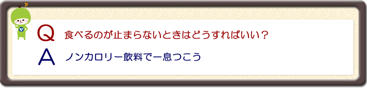 | まず、何か飲んで一息つくことじゃ。 水分が入ると満足感が得られるからじゃ。 ただし、甘い飲み物だとカロリーがあるから、せっかくの 一息が台なしになってしまうぞ。お茶やウーロン茶などノンカロリーの飲み物がいいぞ。 |