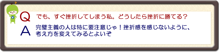 | ダイエットをすると、誰でも挫折感を味わうものじゃ。なかでも、自分のたてた目標がかなりきつく、ちょっとしたことでつまずいた時、「自分はダメなんだ」と思いこみ、途中で投げ出す確率がアップしてしまうぞ。 (1)「絶対におやつは食べない」 (2)「毎日必ず運動をしよう」 (3)「必ず1週間で3kg落とす」 このように完璧主義的な目標をたてると、失敗した時に「どうせ私はダメなんだ」と自分を責めると、思考も暗くなってしまうのじゃ。だから、目標をたてる時は自分を追いつめるような言葉遣いは禁物じゃな。代わりに柔らかい言いまわしをした目標に置き換え、気持ちに余裕を持たせてあげるとよいぞ。すると、上の目標は次のようになる。 (1)「なるべくおやつは食べないようにしよう」 (2)「よく体を動かそう」「運動できなかったら明日頑張ろう」 (3)「まずは3kg落としてみよう」 ほら、全然ニュアンスが違うじゃろ。もし、ダイエットがうまくいかない状態でも、落胆せずに、「まぁ こんなものか。また頑張ろう」と、前向きに考えることがダイエット成功のための第1歩じゃよ。 計画通りに進む完璧なダイエットなどありえない、失敗はつきものだと自覚して、ダイエットに挑むとよいぞ。 「ダイエット中の停滞期を乗り切ろう!」は、ダイエットお役立ち情報に載っているので、そちらも是非見て欲しい。 |