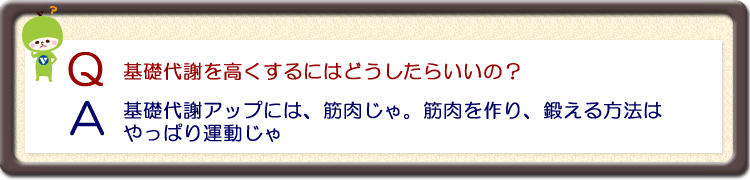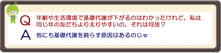 | さて、○はいくつじゃったかな? 実は、このチェック項目全てが、基礎代謝を下げてしまう原因なのじゃよ。 1個でも○があったら、基礎代謝量が下がっているといえる。 特に、5個以上もあった人は要注意じゃ。基礎代謝のレベルが30代~40代にまで下がっている恐れがある。 チェック1の低体温の人は筋肉の発熱量の低下、チェック6の冷え・ほてりがある人は心臓の血液を送りだす力が弱いことなど、筋肉の量が少ないことが大きな原因じゃ。 ○の数が多い人ほど筋肉を鍛えた方が良いというわけじゃな。 |
