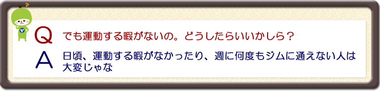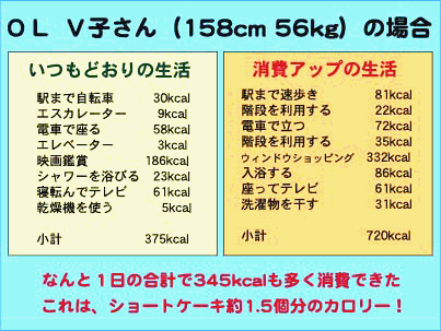 | しかし、特別な時間がとれなくても、普段の心掛け次第でいくらでも運動はできるのじゃよ。運動といっても、特別なスポーツをしなければならないというわけではない。会社の昼休みや家事の合間に体を動かすのも立派な運動じゃよ。 では、日常生活を工夫して運動量を増やした例を挙げてみるぞ。(表1)を参照じゃ。 |