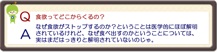 | 「そんなのお腹が空くからでしょう」といわれてしまいそうだが、「なぜお腹が空くのか」「体の中のどのようなシステムで食べる判断がなされ、いつ食べはじめるのか」といった詳しいことは、まだ謎が多いのじゃ。 朝・昼・晩の決まった時間に食べるのは、毎日の習慣として個人、家族、社会が決めることであって、体の命令に従っているからではない。では、その拘束がなくなった時、人間はどれくらい食べるのだろうか。おそらく、本能の赴くまま食べてしまうかもしれん。 例えば、巷で人気の食べ放題。ケーキでも寿司でも焼肉でもなんでもいいんだが、好きなものならいくらでも食べられるじゃろ。どんなにお腹が一杯になっても、目の前においしそうなものが出てきたら、つい手が伸びてしまうんじゃないかな。よく女性が「お腹が一杯でも、食後のデザートは別腹!」なんていうのもいい例じゃ。 これは理性ではなく、本能のなせる技なのじゃ。食欲の秋に打ち勝つためには、本当に体が食べ物を必要としてるのか、冷静になって食欲にストップをかける必要がある。 |