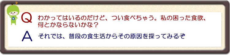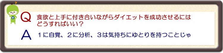 | 次に、どこで太る原因を作っているかを発見しよう。 例を見てわかるように、前日にイチゴムースを買っていなければ余計に食べずに済んだのじゃ。 お腹が空いている時に買い物に行って、余分な食べ物を買いこむのは”太る自分”を作る大きな原因になる。”会社帰りになんとなくコンビニに行く’‘、”目のつく場所に食べ物を置いておく”などというように、最終的に‘食べる’につながる行動は要注意じゃよ。結果的に、食べてしまうだろうと予想のつくことはしないように。自分の側に食べ物がなければ絶対に食べることはないじゃろ。このような‘買い癖’のある人は、ちょっと行動をなおしただけでダイエット成功の第1歩が踏み出せるはずじゃよ。 最後は、ゆったりとした気持ちでダイエットに望むことじゃ。人間は食欲と戦っても、必ず負けてしまうものなのじゃよ。無理に食欲を抑えれば抑えるほど、それが大きなストレスになる。すると、そのストレスを解消するためにドカ食いするという悪循環が生まれるのじゃ。食べることは、手軽なストレス解消法。だから、「食べたい!」と思ったら、本当に空腹なのか、それとも心が欲しがっているだけなのかを見極める必要がある。食べること以外の、ストレス解消法をみつけることもダイエットを成功させるポイントじゃよ。 |