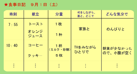 | まずは自分の食生活を知ることが第一じゃ。毎日食事日記をつけて、太りやすい食べ方のくせ、栄養の偏り具合、実際に食べた量を知り、太る原因を見つけよう。日記には、“いつ”、’‘何を’‘、“どのくらい’‘、“何をしながら’‘、”誰と’‘、”どこで’‘、”どんな気分で”と記入しよう。”どんな気分”は必須項目じゃ。空腹感以外で、つい食べてしまうときの気持ちを自覚できるぞ。表を参考にして今日からはじめてみてはいかがかな。 |
