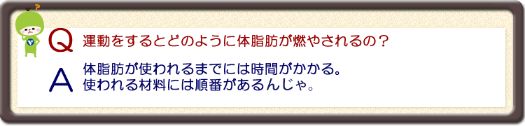 | 我々が運動し始めると、最初に使われるのが筋肉の中に貯えられているグリコーゲンじゃ。グリコーゲンが分解されてなくなると、次は、肝臓からのグリコーゲンが分解されて、エネルギーに変わる。そして、最後に脂肪組織から分解された遊離脂肪酸がエネルギーとして利用されるのじゃ。 このような順序により体内に蓄積されている脂肪が分解されて、筋肉運動中のエネルギーとして使われ、体脂肪が減少するのじゃ。 ちなみに、運動を開始してから5~10分は、主に筋肉や肝臓に蓄えられているグリコーゲンが、そして10分を過ぎた頃から遊離脂肪酸が使われ、少しずつ体脂肪がエネルギーに変えられる。つまり、15~20分間は運動を続けていなければ体脂肪は燃えないといえるぞ。 |