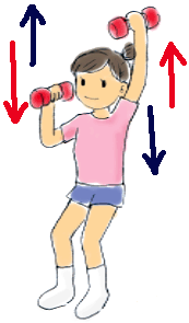 ・足は肩幅、背筋を伸ばし、膝は少し曲げる。 ・ダンベルを握り、手首をやや内側に固定。両肩の高さに構える ・一方のダンベルをゆっくり押し上げる。ゆっくり引き下ろしながら、もう一方のダンベルを上げる。 ・交互に上げ下ろしを繰り返す。 (左右各10~20回) |