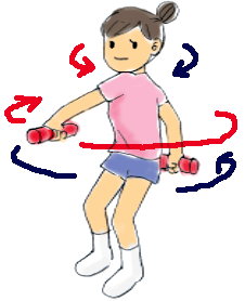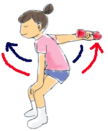 ・足は肩幅、上体は少し前傾、膝は少し曲げる。 ・ダンベルを右に振ったら顔は左に向ける。腰を固定させてお腹だけをひねるようにする。 ・反対方向も同様に行う。 (左右へ各20~30回) |