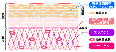 私たちの皮膚は、大きく表皮と真皮に分けることができます。表皮は一番外側に見えている角質層と、新しい皮膚の細胞を作る基底層からなりますが、基底層を支える役割を果たしているのが、その下に存在する真皮です。